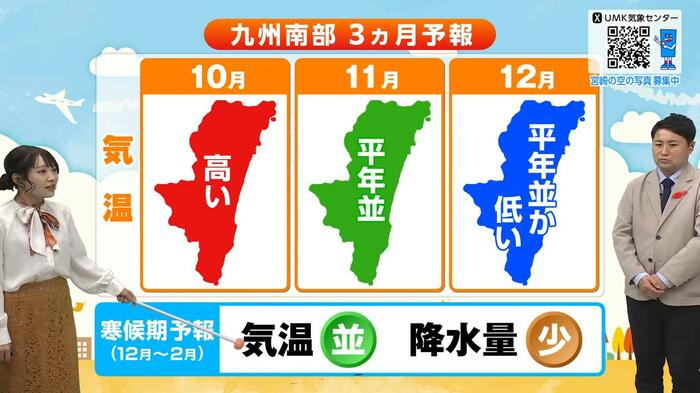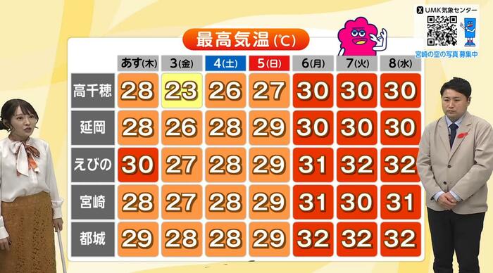 10月の予想最高気温を見ていくと、これから夏が来るのか?という数字が並んでいる。5日までは20℃台だが、6日から30℃を超え、都城やえびのでは32℃と、1年で最も暑い時期の平年値。10月の予想気温とは思えない数字だ。