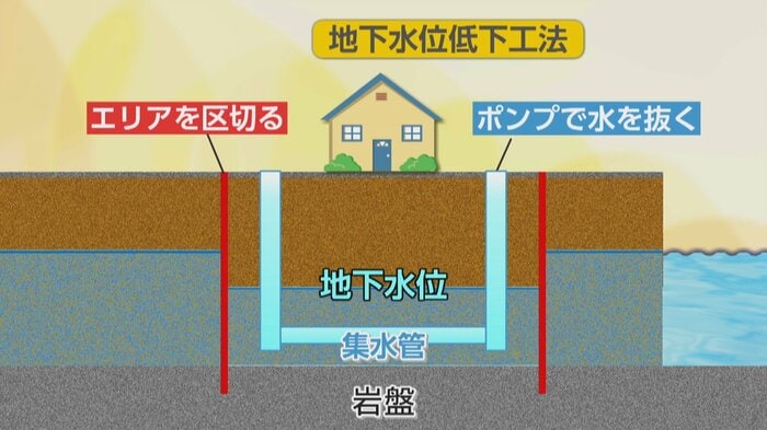この地域では先月、液状化対策の実証実験に向けた工事が県内で最も早く始まった。射水市が検討しているのは、ポンプで地盤の水を抜き地下水位を低くすることで地盤を強固にする対策だ。この工法は他の工法より工事費用を抑えられる利点があるが、ポンプの電気代などの「維持管理費」を誰がどの程度負担するかが課題となっている。