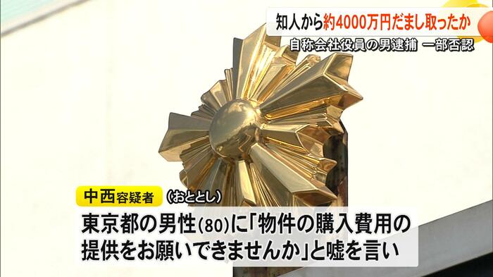 警察によると、中西容疑者は2023年1月から2月の間に、東京都に住む高齢の男性(80)に対し、「物件の購入費用の提供をお願いできませんか」などと嘘を言い、約4000万円をだまし取った疑いが持たれている。