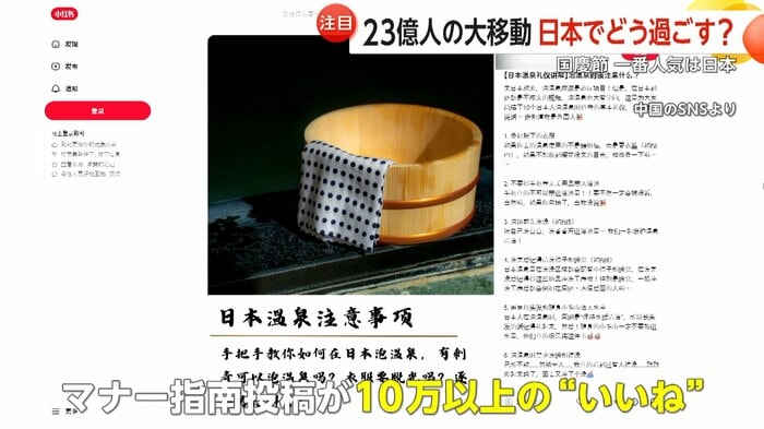 中国版インスタグラムでは、日本に訪れる観光者向けに、寿司の食べ方や温泉の入り方などのマナーを指南する投稿があり、10万以上の「いいね」がつくなど注目を集めた。