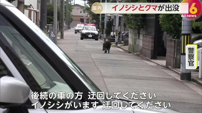 後続の車の方、迂回してください。イノシシがいます。迂回してください。