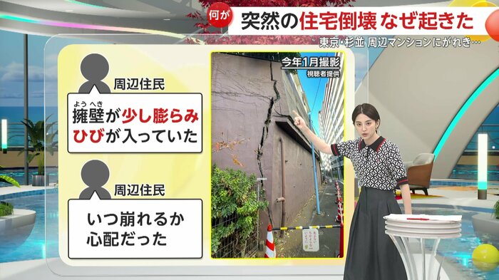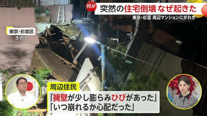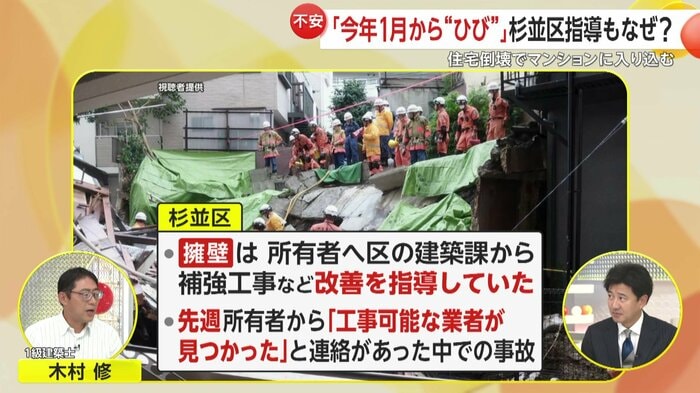 1日、取材で現地に行ったという木村さん。「私も杉並区内で耐震診断を業務としてやっておりますが、こういった擁壁が倒壊するのは非常にまれといいますか、今まで見たことがない。相当ビックリしました」と驚きを隠せない。