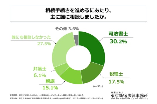 調査の最後、「相続手続きを進めるにあたり、主に誰に相談したか」を尋ねる設問への回答では、1位が「司法書士」で30.2%、2位が「誰にも相談しなかった」で27.5%、3位が「税理士」で17.5%という結果になりました。1位の回答と3位の回答及び「弁護士(6.1%)」の回答を合計すると回答率50%を超える形となり、この結果から、直近5年以内に相続手続きを経験した人の半数以上が、手続きを進めるにあたり、主に「法律を扱う専門家」に相談していることが明らかになりました。