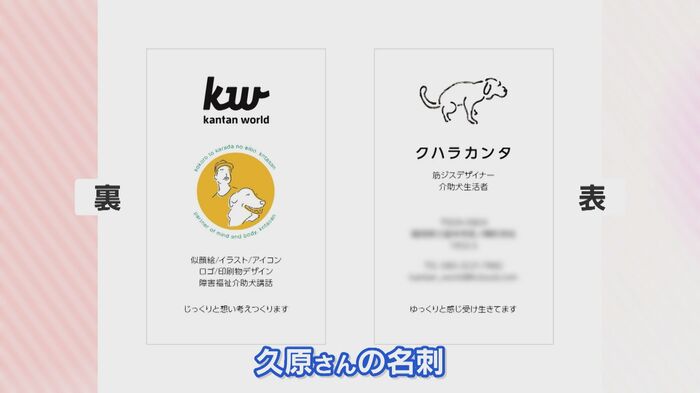 現在、デザインの仕事をしている久原さん。名刺には、サンちゃんと自身の笑顔をアイコンとして描き、介助犬との生活をアピールしている。「充実感。幸福感。サンちゃんが来てくれて良かった」と全て前向きに捉えることができるようになったという。