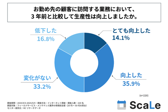 フィールドサービス・メンテナンス業界で現場の業務に3年以上従事する人の半数が、顧客に訪問する業務において、3年前と比較して生産性は向上したと感じている