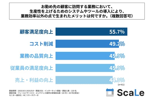 フィールドサービス・メンテナンス業界の現場の業務の生産性向上に影響したものは「システムやツールの導入・活用」と回答された方を対象に、「勤め先の顧客に訪問する業務において、生産性を上げるためのシステムやツールの導入により、業務効率以外の点で生まれたメリット」を尋ねる設問への回答では、1位が「顧客満足度向上」で55.7%、2位が「コスト削減」で49.2%、3位が同率で「業務の品質向上」と「従業員の満足度向上」で45.9%という結果になりました。この結果から、フィールドサービス・メンテナンス業界の現場の業務にシステムやツールを導入・活用することにより、業務効率以外に生まれたメリットとして最も多くの人が感じるのは「顧客満足度向上」であることが判明しました。