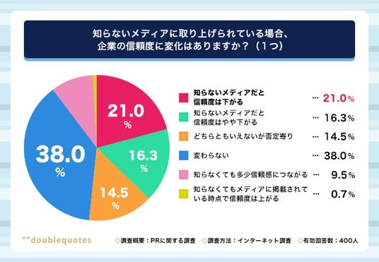 次に「知らないメディアに取り上げられている場合、企業の信頼度に変化はありますか?」と質問したところ、『知らないメディアだと信頼度は下がる』と回答した方が84人(21.0%)となりました。そのうち18人(4.5%)が『知らないメディアだと信頼度はかなり下がる』、66人(16.5%)が『知らないメディアだと信頼度は下がる』と言っていました。