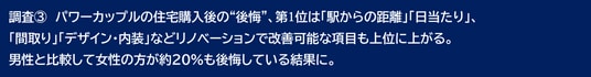 調査3. パワーカップルの住宅購入後の“後悔”、第1位は「駅からの距離」「日当たり」、「間取り」「デザイン・内装」などリノベーションで改善可能な項目も上位に上がる。