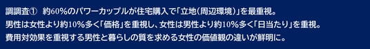 調査1. 約60%のパワーカップルが住宅購入で「立地(周辺環境)」を最重視。