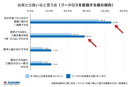 食品ロス削減のためには、消費者に精神的な負担を与えず、楽しい食事時間を提供することが‟美味しさ”に通ずる重要なポイントです。今回の調査では、そのために「事前に量がわかること」や「自分で量を選べること」が効果的であることが分かりました。特にフードロスを意識している人ほど、こうした仕組みを求める傾向が強く見られました。