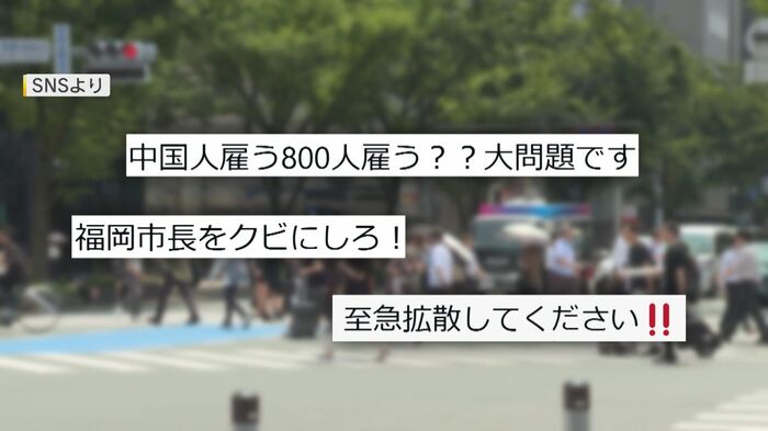 ネット上では「中国人雇う、800人雇う??大問題です」(女性)、「福岡市長をクビにしろ!」(男性)、「至急、拡散してください」(男性)といった誤った情報が拡散した。中には、福岡市役所の電話番号を記して問い合わせを呼びかける人まで現れたという。