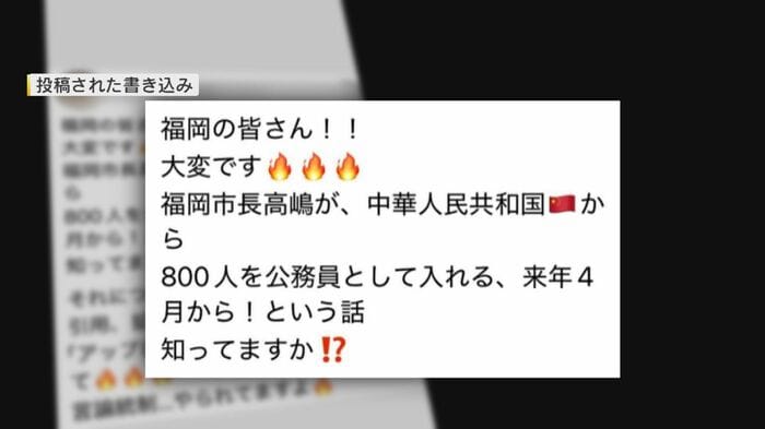 福岡市が中国人800人を職員にする。投稿者は、この情報を周囲に呼びかけたのだ。