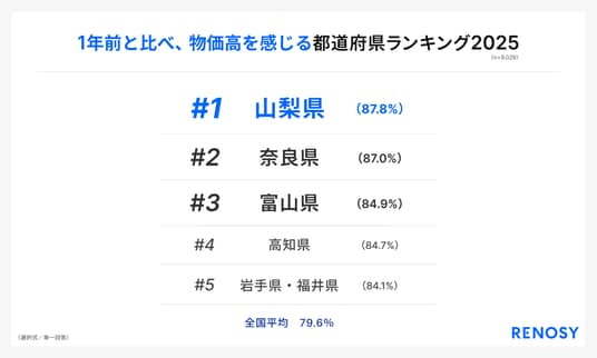 まず、日々の生活の中で「1年前と比べ、物価高を感じる」回答者の割合をランキング化したところ、1位は山梨県(87.8%)、2位は奈良県(87.0%)、3位は富山県(84.9%)という結果でした。また全国平均が79.6%であることから、特定の地域だけでなく全国的に物価高を感じていることがわかります。