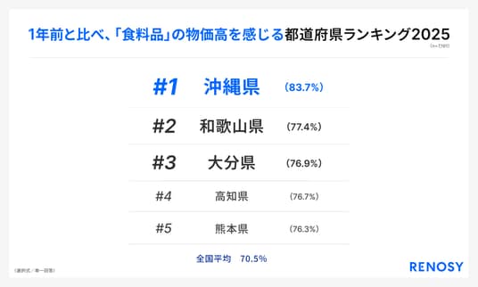 さらに、「1年前と比べ、物価が上がった」と回答した人に向けて、特に上がったと感じる品目(※5)を質問しました。そのうち「食料品」については、全国平均70.5%の割合で価格が上がったと回答しています。また、回答の割合をランキング化したところ、1位沖縄県(83.7%)、2位和歌山県(77.4%)、3位大分県(76.9%)となりました。