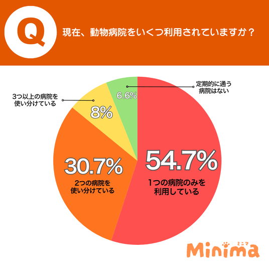 現在の動物病院の利用状況について尋ねたところ、「1つの病院のみ利用している」が75名(54.7%)で最も多かったものの、「2つの病院を使い分けている」が42名(30.7%)、「3つ以上の病院を使い分けている」が11名(8.0%)と、合計で45.3%の飼い主が複数の病院を利用していることが分かりました。