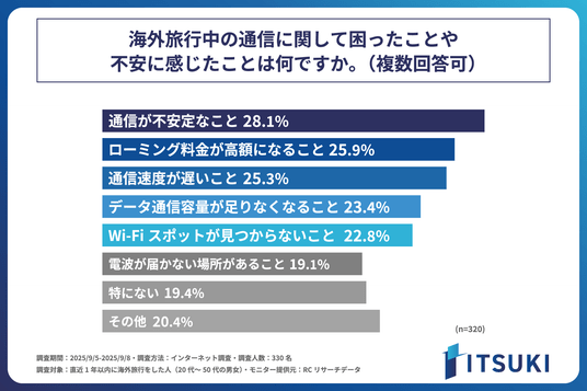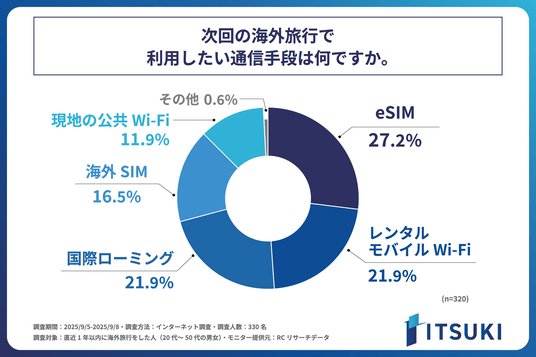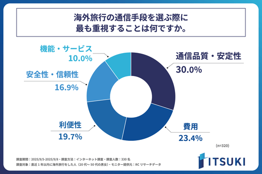 近年、コロナ禍を経て海外旅行が本格的に再開し、多くの人が再び海外へ渡航しています。スマートフォンが情報収集からキャッシュレス決済、SNSでのコミュニケーションまで担う現代において、海外滞在中の快適なインターネット通信環境は、旅に不可欠なものとなりました。一方で、海外での通信手段は、レンタルモバイルWi-Fiや各通信事業者の国際ローミングサービスに加え、近年ではeSIMなども登場し、その選択肢は多様化しています。しかし、選択肢が増えたことで、かえって「どの通信手段を選んだら良いかわからない」といった新たな課題も生まれているのではないでしょうか。そこで今回、株式会社ITSUKIは、現代の海外旅行者がどの通信手段を選び、利用しているのか、また、どのような点に不便や不安を感じているのか、そのリアルな実態を明らかにするため、直近1年以内に海外旅行をした人を対象に「海外旅行者の通信利用実態に関する調査」を実施しました。