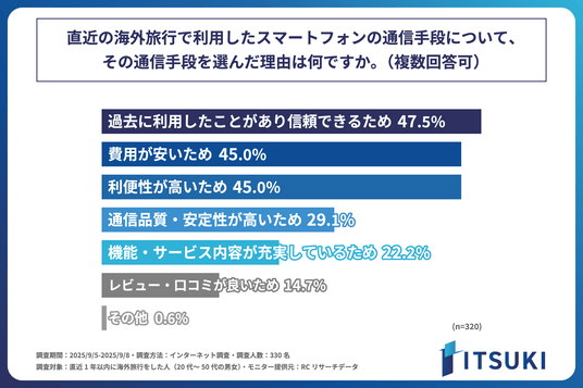 次に、海外旅行でスマートフォンの通信を利用した(通信を利用しなかった以外)と回答した人を対象に「直近の海外旅行で利用したスマートフォンの通信手段について、その通信手段を選んだ理由」を尋ねる設問への回答では、1位が「過去に利用したことがあり信頼できるため」で47.5%、2位が同率で「費用が安いため」と「利便性が高いため」で45.0%という結果になりました。この結果から、海外旅行でスマートフォンの通信を利用した人が、その通信手段を選んだ理由として最も多いのは、「過去に利用したことがあり信頼できるため」であることがわかりました。