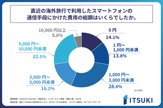インターネット回線事業を行う株式会社ITSUKI(本社:東京都北区、代表取締役:岩下 一樹)は、直近1年以内に海外旅行をした人(20代~50代の男女)を対象に「海外旅行者の通信利用実態に関する調査」を実施しました。この調査から、直近1年以内に海外旅行をした人が海外で利用したスマートフォンの通信手段やその費用、海外旅行での通信に関して困ったことなどが明らかになりました。