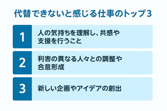 - 代替できないと感じる仕事トップ3: 1位:人の気持ちを理解し、共感や支援を行うこと 2位:利害の異なる人々との調整や合意形成 3位:新しい企画やアイデアの創出