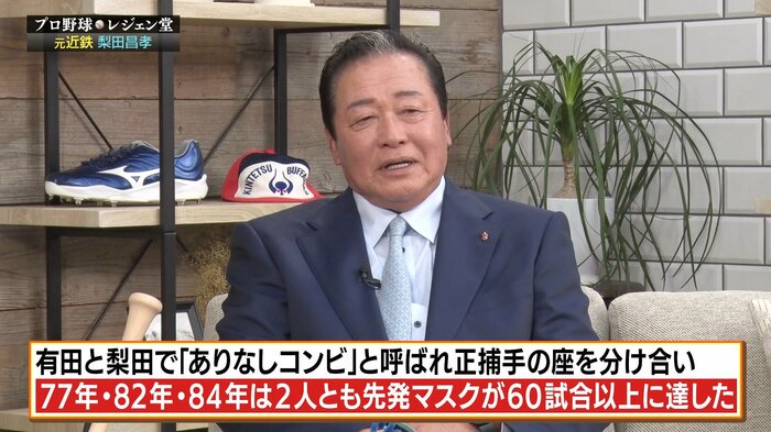有田と梨田で「ありなしコンビ」と呼ばれ、正捕手の座を分け合い、77年・82年・84年は2人とも先発マスクが60試合以上に達した。