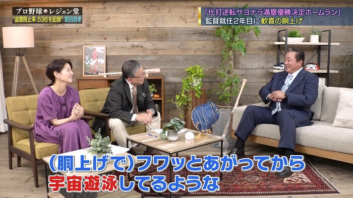いやー、なんか夢のようっていうか、胴上げのシーンもいっぱいありますけど、ふわって上がってから、なんか本当、宇宙遊泳してるようなね、宇宙船に乗ってるような感じの胴上げだったなっていうのは。