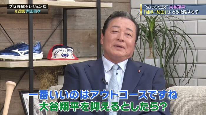 一番いいのは、やっぱりアウトコースですね。彼、インサイドギリギリの球をレフトでホームランするんですよ。ですから、大谷君がインサイドを投げるんだったら、右のツーシーム。こう曲がってくるスライダーのようなね、左のスライダーみたいな球をインサイドから投げると、ちょっと腰が引くんですね。あとは基本、外。