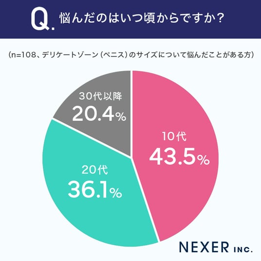 デリケートゾーンのサイズに悩み始めた時期については、「10代」と答えた人が最も多く約4割を占めました。