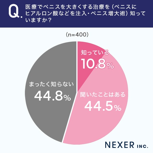 ペニスを大きくする医療的な治療については、「知っている」「聞いたことがある」と答えた人が半数以上でしたが、「まったく知らない」もほぼ同数で拮抗する結果に。