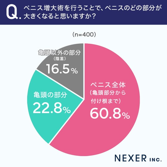 ペニス増大術で大きくなる部分については「ペニス全体」と答えた人が6割を占め、最も多い結果となりました。
