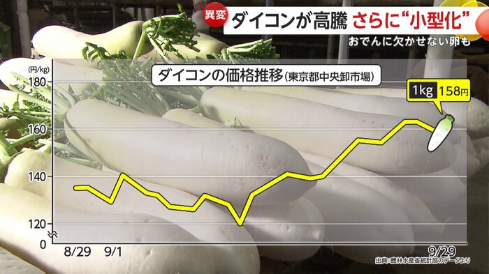 東京でのダイコンの卸売価格を見ると、8月下旬には1キロあたり135円だったが、わずか1ヶ月ほどで158円にまで上昇していた。