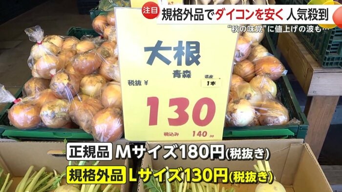 正規品のダイコンMサイズで180円(税抜き)だが…規格外品のLサイズで130円(税抜き)。