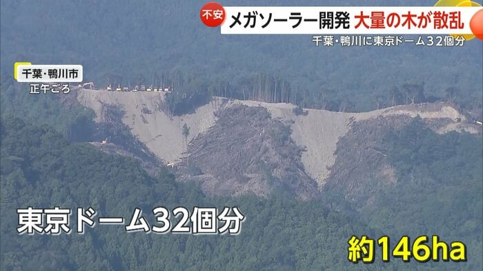 千葉・鴨川市で、大規模な太陽光発電施設の建設が進められ、東京ドーム32個分の146haに36万5000本の樹木を伐採し、47万枚のパネルを設置する計画があるという。