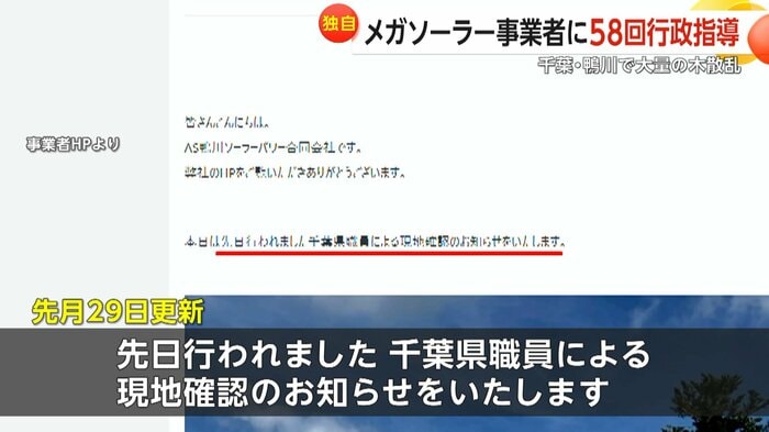 事業者のホームページは9月29日、「先日行われました、千葉県職員による現地確認のお知らせをいたします」と、写真とともに十分な安全対策をたてて進めていると更新されていた。