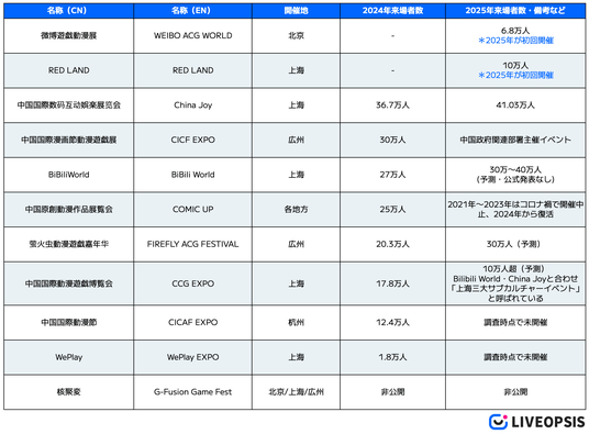 ※スパイスマート調査|中国ゲーム・アニメ関連展示会・イベント一覧(2024年来場者数 降順)