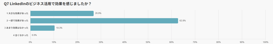 LinkedInをビジネスで活用した経験があるユーザーに対し、その効果実感を尋ねたところ、実に89.7%が「何らかの成果を感じた」と回答しました。