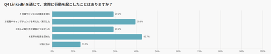 LinkedInの利用が実際にユーザーの行動へどのような影響を与えているかを確認したところ、最も多かったのは「業界の知見を深めた」で42.7%に上りました。