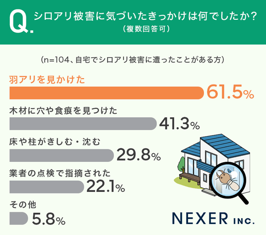 次いで「木材に穴や食痕を見つけた」が41.3%、「床や柱がきしむ・沈む」が29.8%と、被害が進行した後の兆候で気づくケースも多いことが示されました。