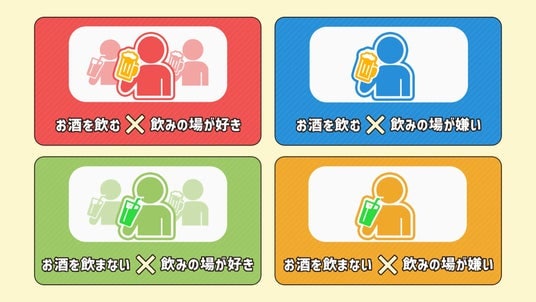 調査対象は「飲酒の有無」と「飲み会の好み」の掛け合わせで、以下の4タイプに分類しています。