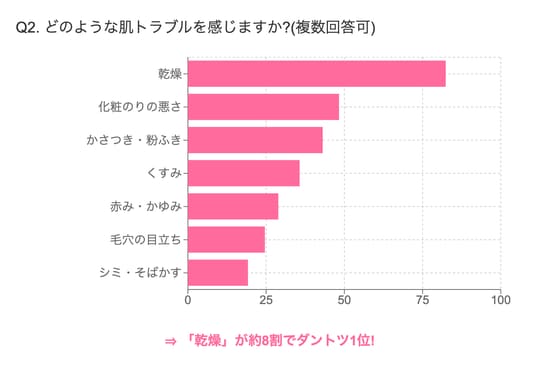 その結果、最も多いのは「乾燥」で約82%、次いで「化粧のりの悪さ」(48%)、「かさつき・粉ふき」(43%)という結果になりました。