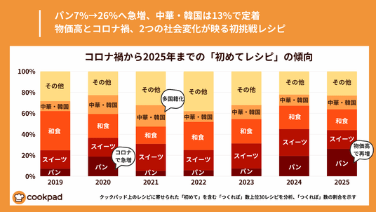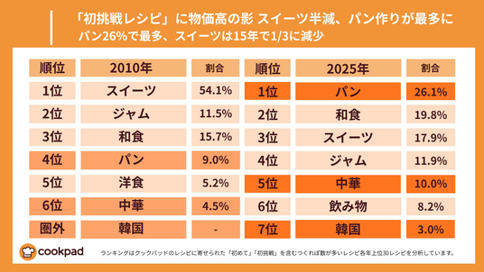 利用者数No.1レシピサービス「クックパッド」を運営するクックパッド株式会社は、2010年から2025年にかけて、ユーザーが「初めて挑戦する料理」の変遷を調査しました。クックパッド上のデータを調査した結果、かつて「初めて挑戦レシピ」の半数以上を占めていたケーキなどのスイーツが2025年には18%まで減少する一方、パンが26.1%で最多となりました(※1)。特に2024年以降、食品価格高騰と時期を同じくしてパンへの初挑戦が急増しており、物価高を背景に家庭での料理の「初めて挑戦レシピ」が趣味性から実益性へとシフトしている実態を報告します。