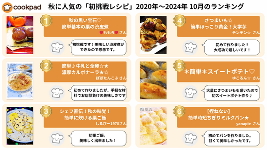 過去5年間の10月データを分析すると、「渋皮煮」「大学芋」「栗ご飯」など秋の味覚を使った料理が、毎年「初めて挑戦レシピ」の上位に入っています。年間を通じては実益重視の傾向が強まる一方で、季節の旬を楽しむ初挑戦は根強く残っています。■変化を乗り越える家庭料理の知恵を紡いで