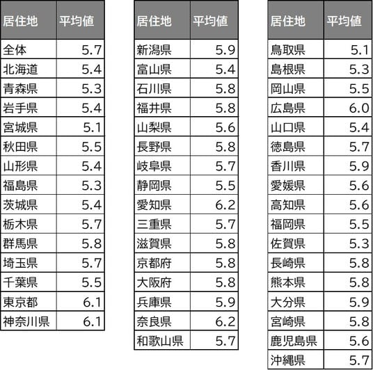 自身の健康を10~0で示す設問では、全国平均値は5.7でした。都道府県単位でも大きな差異は無く、最大値は愛知県(6.2)と0.5ポイント差でした。