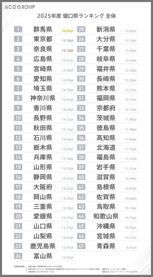 株式会社SCOグループ(本社:東京都千代田区、代表取締役会長:玉井雄介、以下「SCOグループ」)は、自社で推進している「オーラルライフプロジェクト」の活動の一環として10月5日を「人生105年の日」と制定しました。さらに、いきいきと105年活きるために必要な、「お口の健康」についての意識向上を目的として「お口や生活習慣などに関する意識調査」の結果などのデータをポイント化し、各都道府県でランキング化しました。