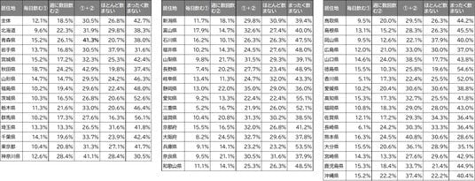 全体的に9割以上が「毎日みがく」と回答。一方で、福島県では1割が「ほとんどみがかない」と回答するなど、日々のケアがなされていない人が一定数いることがわかりました。