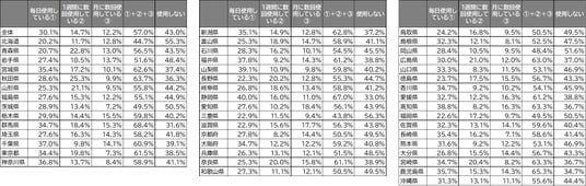 アメリカの歯周病学会が1998年に発表したキャッチコピー「Floss or Die」にもあるように、フロスの使用は日頃の口腔ケアに欠かせません。しかしながら、「毎日使用している」人は全体でも3割程度と、高くないことがわかりました。毎日~月に数回使用者を足しあげると、群馬県が最も多く(68.4%)、三重県が最も低い(43.8%)結果となりました。