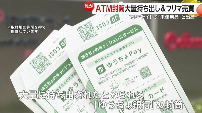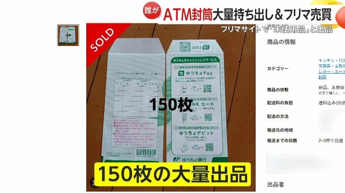 大量に持ち出されたとみられるゆうちょ銀行の封筒は、フリマサイトに40枚300円で出品されていた。中には、150枚もの大量出品も見られる。