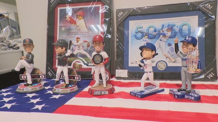 会場には、大谷選手のユニフォームやボブルヘッド人形など、およそ400種類が所狭しと並んでいます。