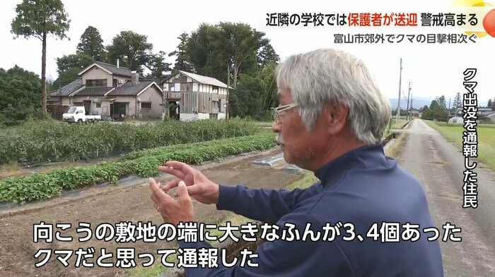 目撃した住民は「用水の縁を歩いてきてガードレールから上がってきた、畑を横切って、その家の敷地内の前を通って行った」と証言。また「向こうの敷地の端に大きなふんが3、4個あった。クマだと思って通報した」と状況を説明している。