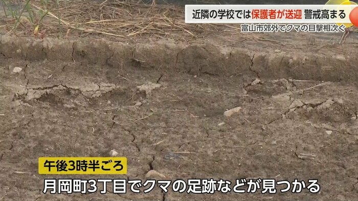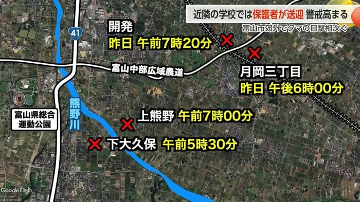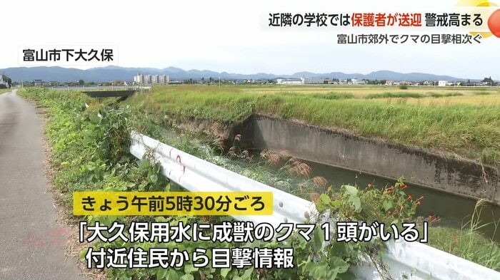 富山市郊外の住宅地でクマの目撃情報が相次いでいる。10月3日朝、富山市下大久保の大久保用水で成獣のクマ1頭が目撃され、市や警察、猟友会などがパトロールを行っている。周辺の小学校では児童の安全確保のため、保護者による送迎などの対応が取られている。