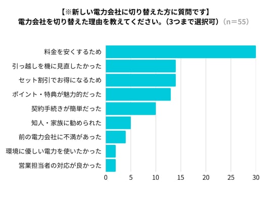新しい電力会社に切り替えた55人の理由(複数選択可)を分析すると、「料金を安くするため」が30件(54.5%)と過半数を占めました。次いで「引越しを機に見直したかった」が14件(25.5%)、「セット割引でお得になるため」が14件(25.5%)と続き、経済性を重視する傾向が明確に表れました。